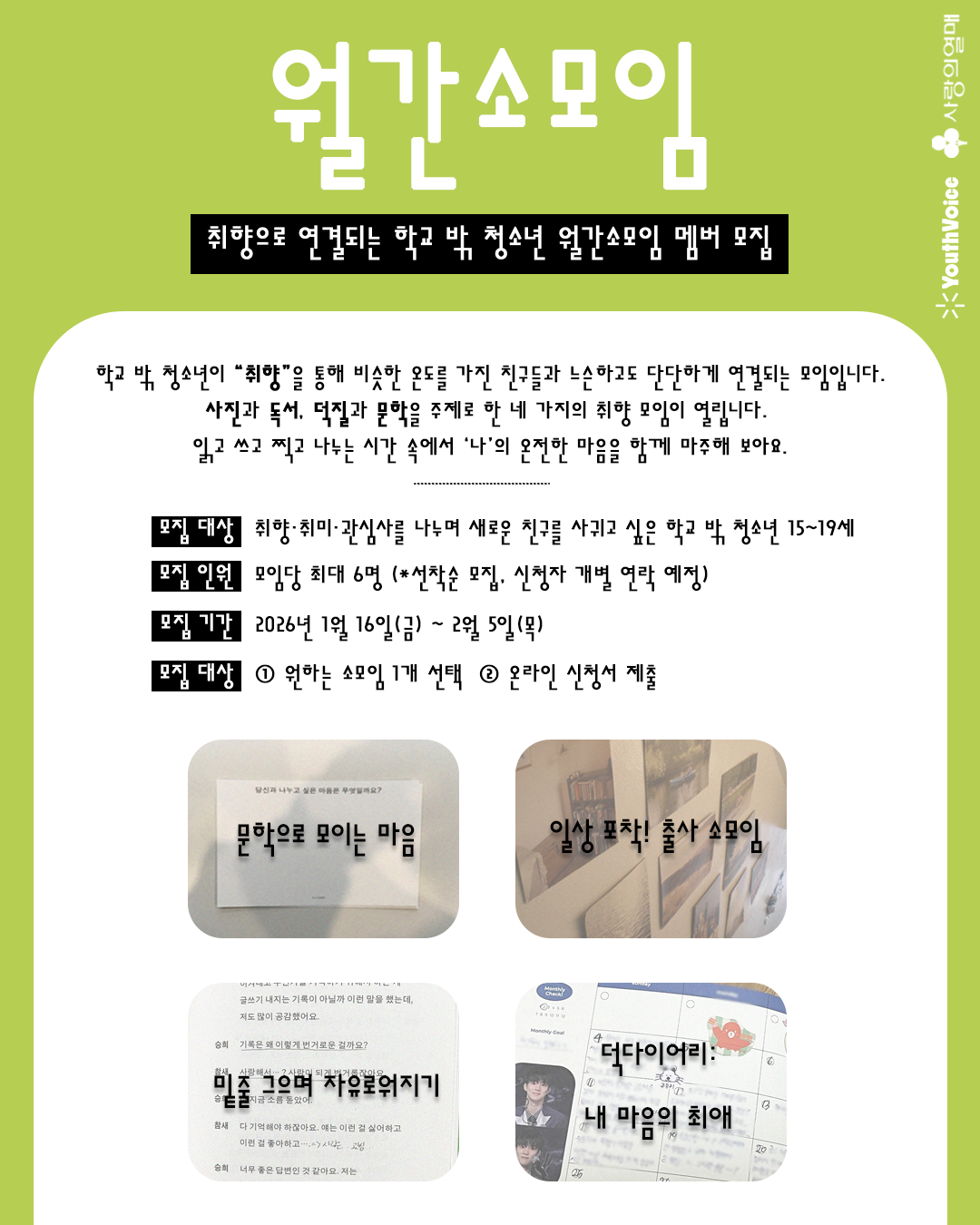 월간소모임은 학교 밖 청소년이 취향을 매개로 또래와 연결되며, 모임을 이끄는 대학생(청년) 모임장과 교류하는 프로그램입니다. 이번 월간소모임은 ‘책’, ‘문학’, ‘덕질’, ‘사진’을 주제로 한 4개의 모임이 열립니다.
